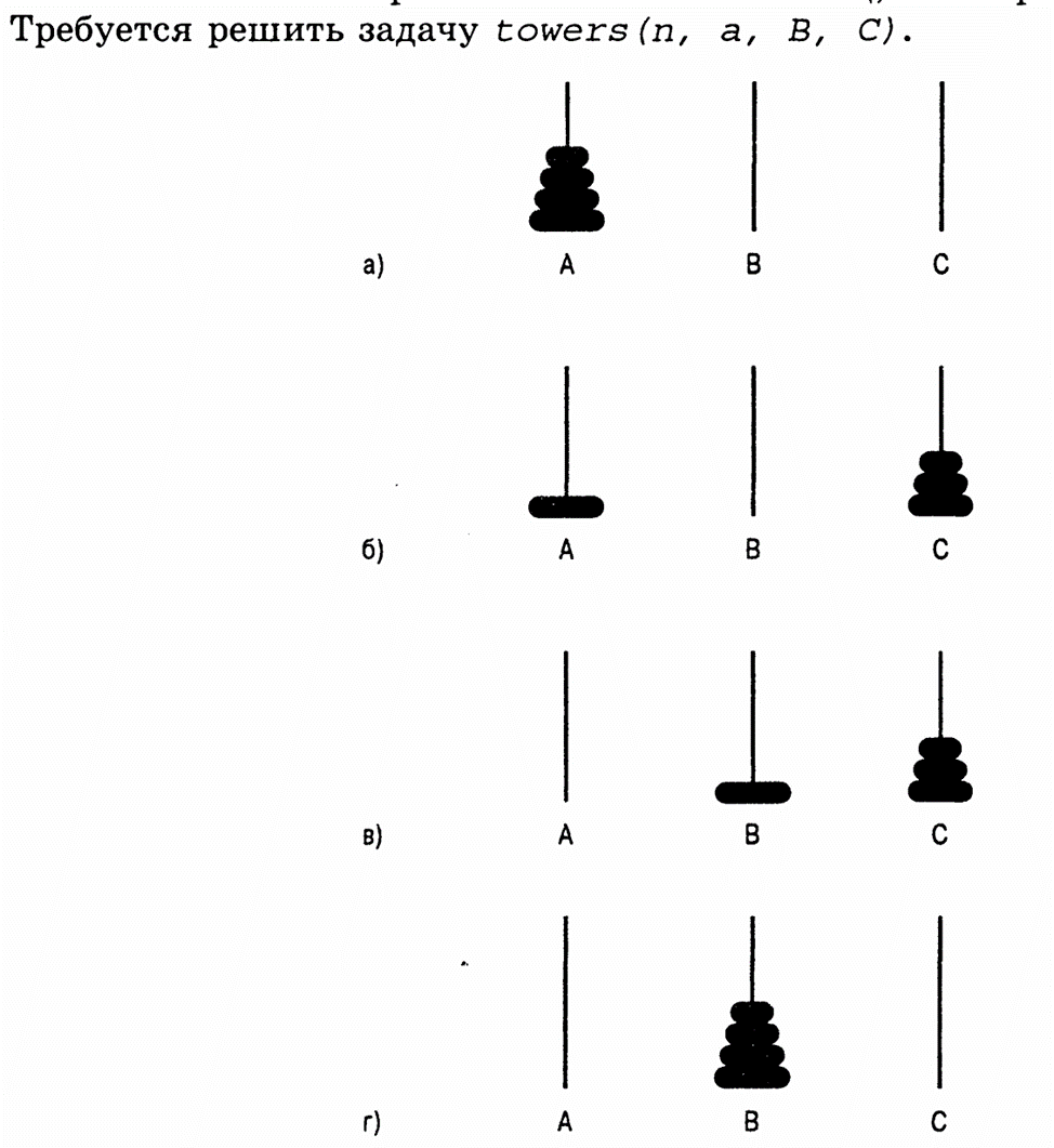 Решить задачу — towers(n - 1, C, B, A). Кольца с количеством — «n - 1» — нужно переместить со стержня — «C» — на — «B» — используя — «A» — в качестве запасного. На стержне — «B» — уже нанизано самое большое кольцо, что мы игнорируем. После этого исходная задача оказывается решённой: все кольца нанизаны на стержень — «B».